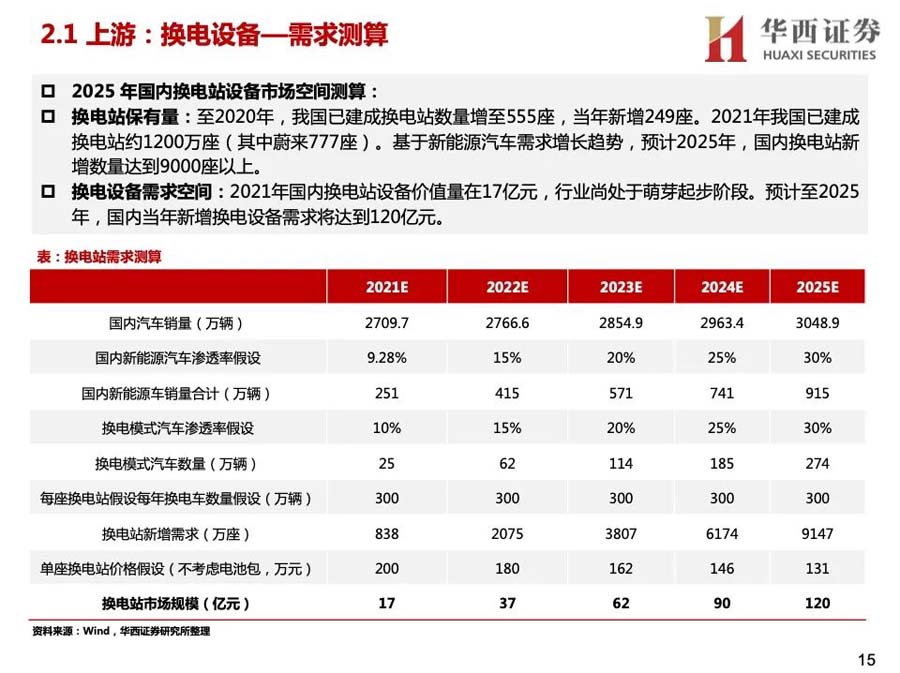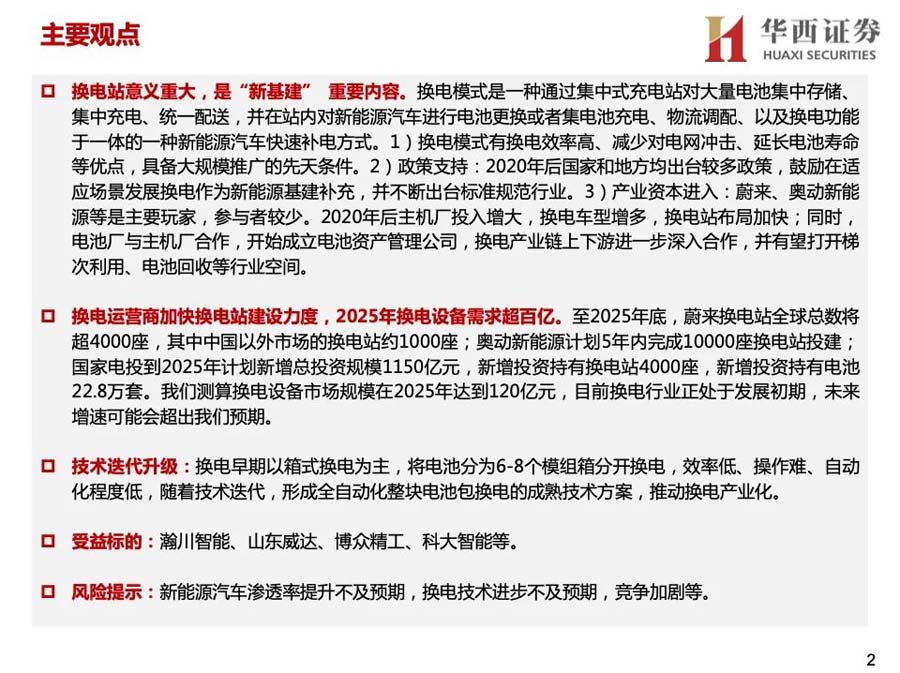 換電運(yùn)營商加快換電站建設(shè)力度,2025年換電設(shè)備需求超百億。至2025年底,蔚來換電站全球總數(shù)將超4000座,其中中國以外市場(chǎng)的換電站約1000座;奧動(dòng)新能源計(jì)劃5年內(nèi)完成10000座換電站投建;國家電投到2025年計(jì)劃新增總投資規(guī)模1150億元,新增投資持有換電站4000座,新增投資持有電池22.8萬套。我們測(cè)算換電設(shè)備市場(chǎng)規(guī)模在2025年達(dá)到120億元,目前換電行業(yè)正處于發(fā)展初期,未來增速可能會(huì)超出我們預(yù)期。