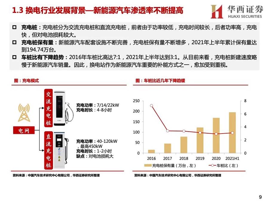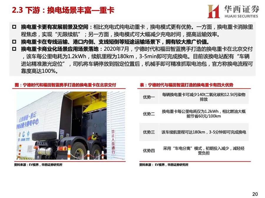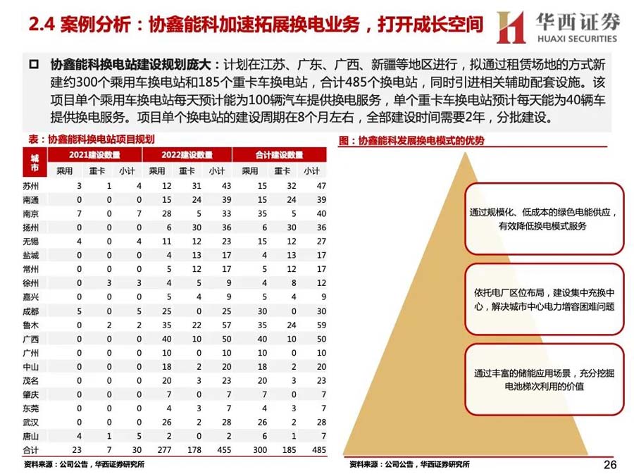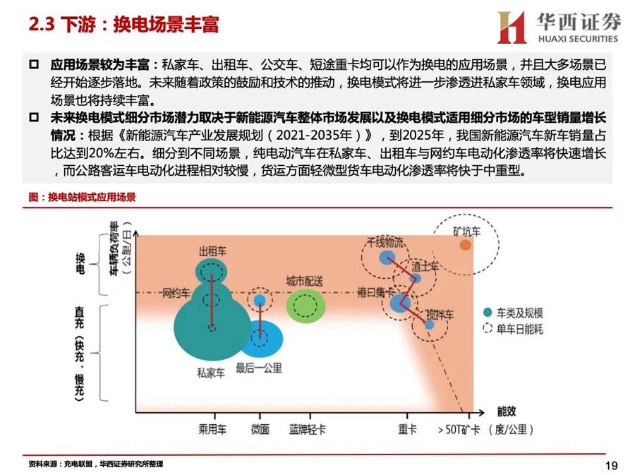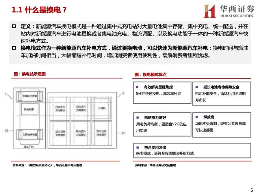 1)換電模式有換電效率高、減少對(duì)電網(wǎng)沖擊、延長電池壽命等優(yōu)點(diǎn),具備大規(guī)模推廣的先天條件。