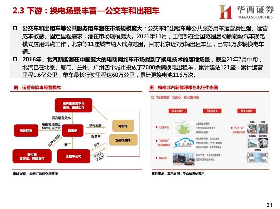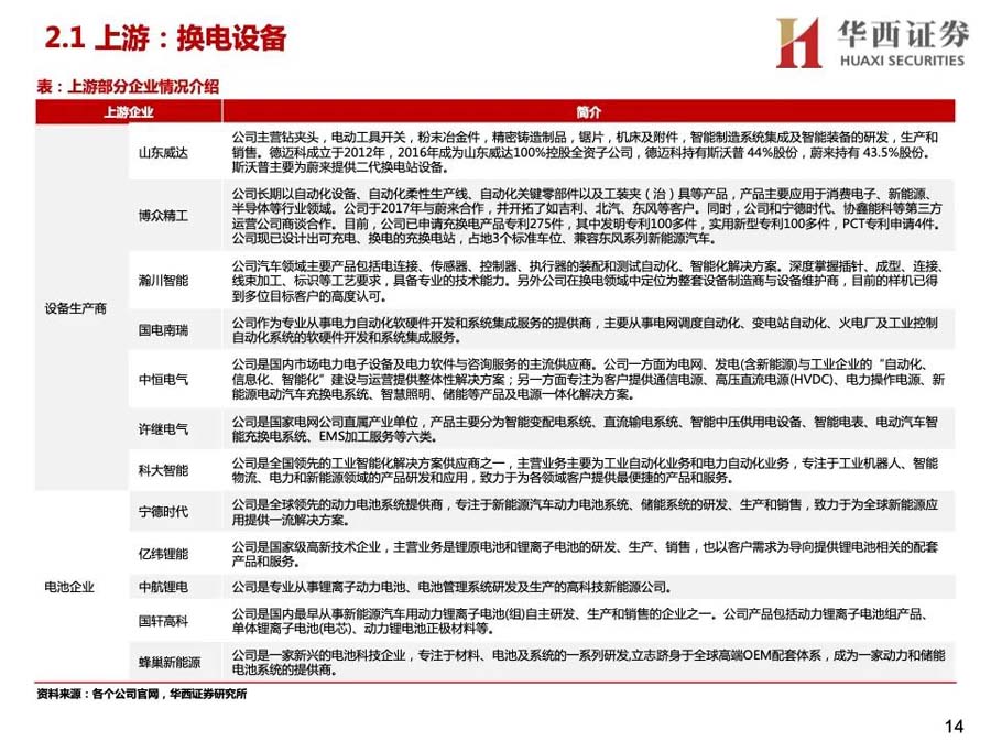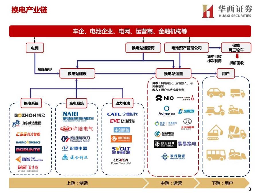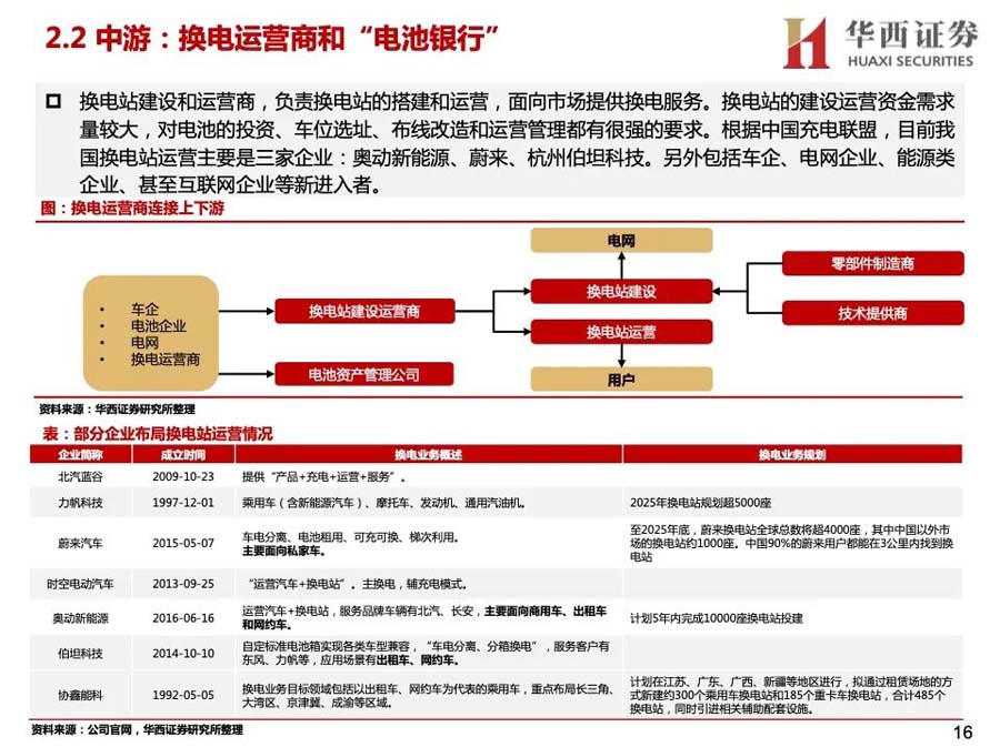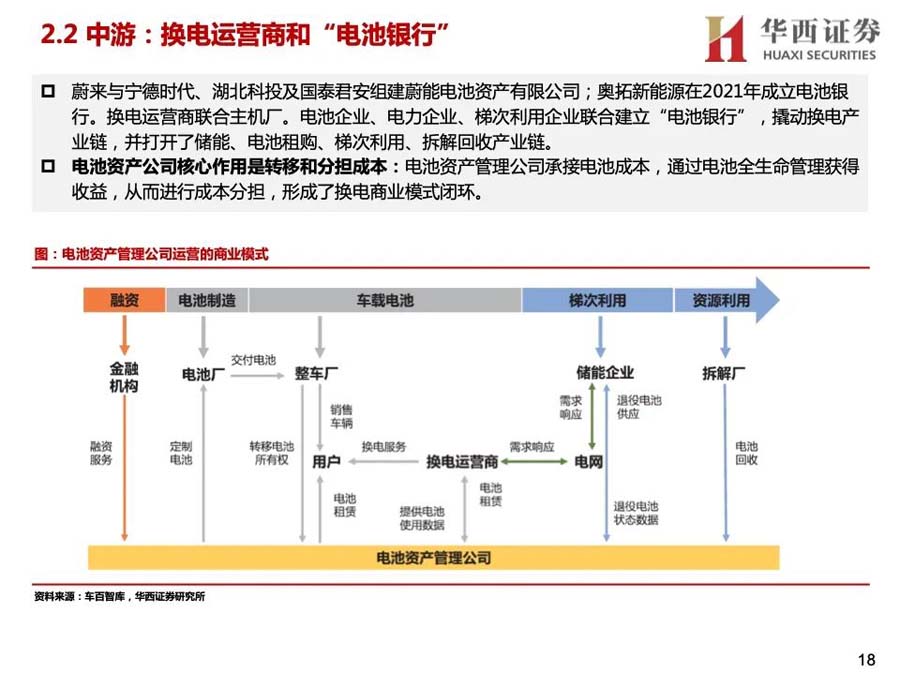 3)產(chǎn)業(yè)資本進(jìn)入:蔚來、奧動(dòng)新能源等是主要玩家,參與者較少。2020年后主機(jī)廠投入增大,換電車型增多,換電站布局加快;同時(shí),電池廠與主機(jī)廠合作,開始成立電池資產(chǎn)管理公司,換電產(chǎn)業(yè)鏈上下游進(jìn)一步深入合作,并有望打開梯次利用、電池回收等行業(yè)空間。