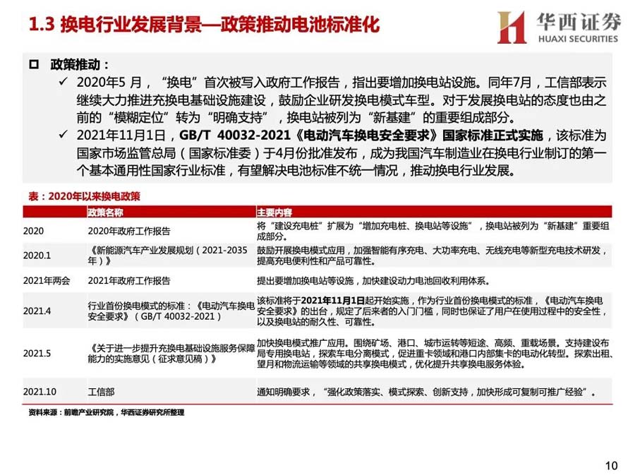 2)政策支持:2020年后國家和地方均出臺(tái)較多政策,鼓勵(lì)在適應(yīng)場(chǎng)景發(fā)展換電作為新能源基建補(bǔ)充,并不斷出臺(tái)標(biāo)準(zhǔn)規(guī)范行業(yè)。