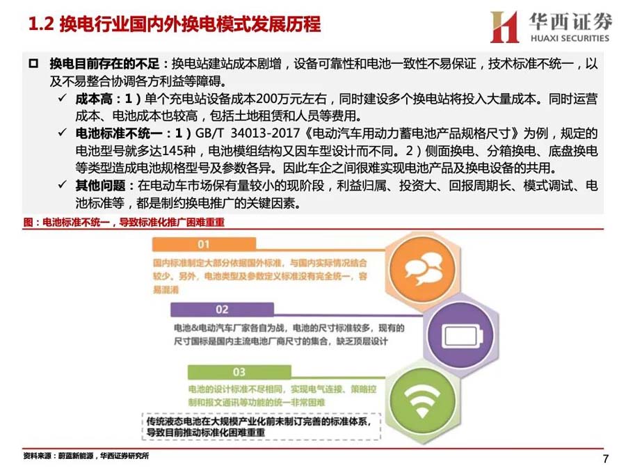 技術(shù)迭代升級(jí):換電早期以箱式換電為主,將電池分為6-8個(gè)模組箱分開換電,效率低、操作難、自動(dòng)化程度低,隨著技術(shù)迭代,形成全自動(dòng)化整塊電池包換電的成熟技術(shù)方案,推動(dòng)換電產(chǎn)業(yè)化。